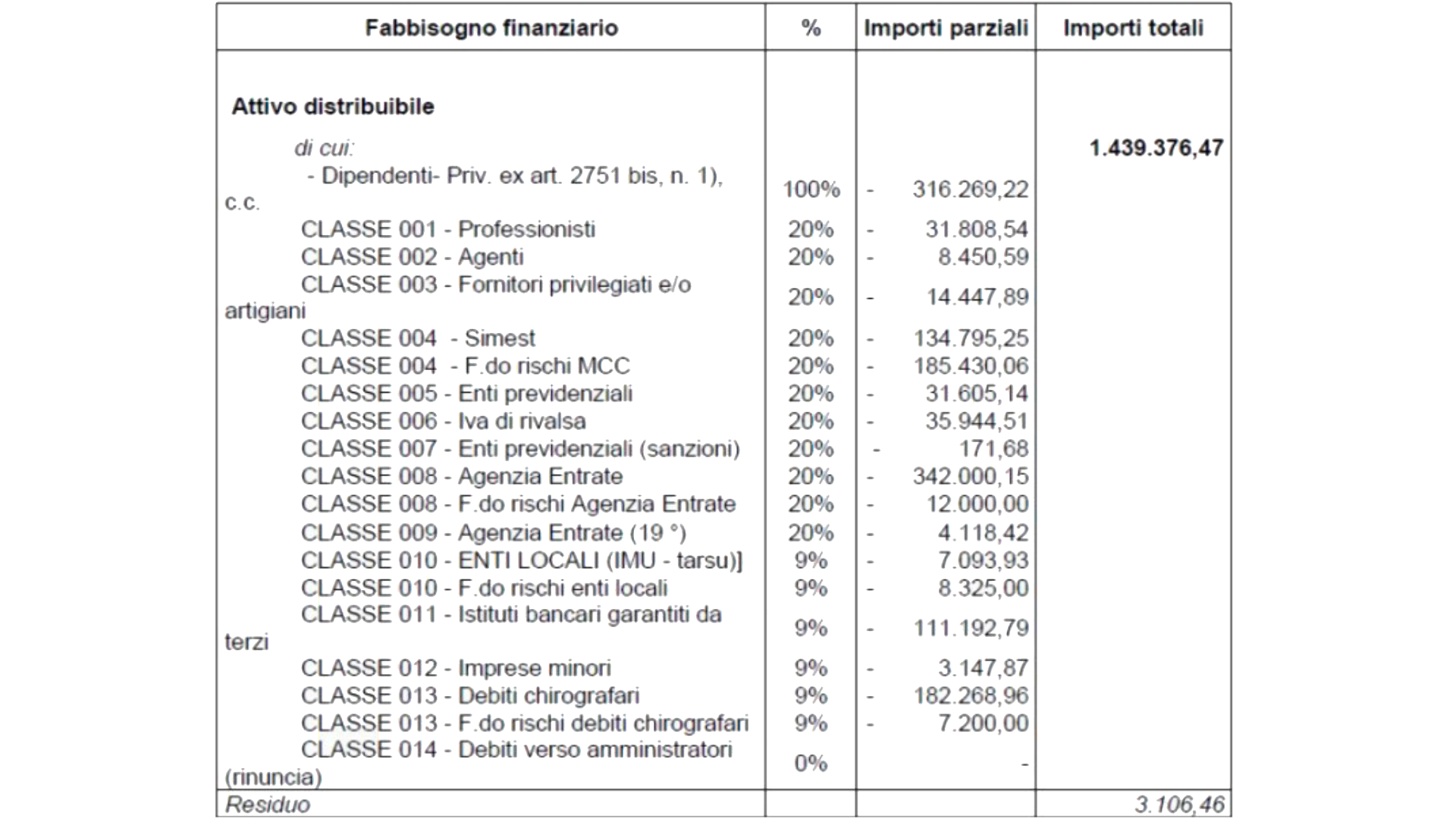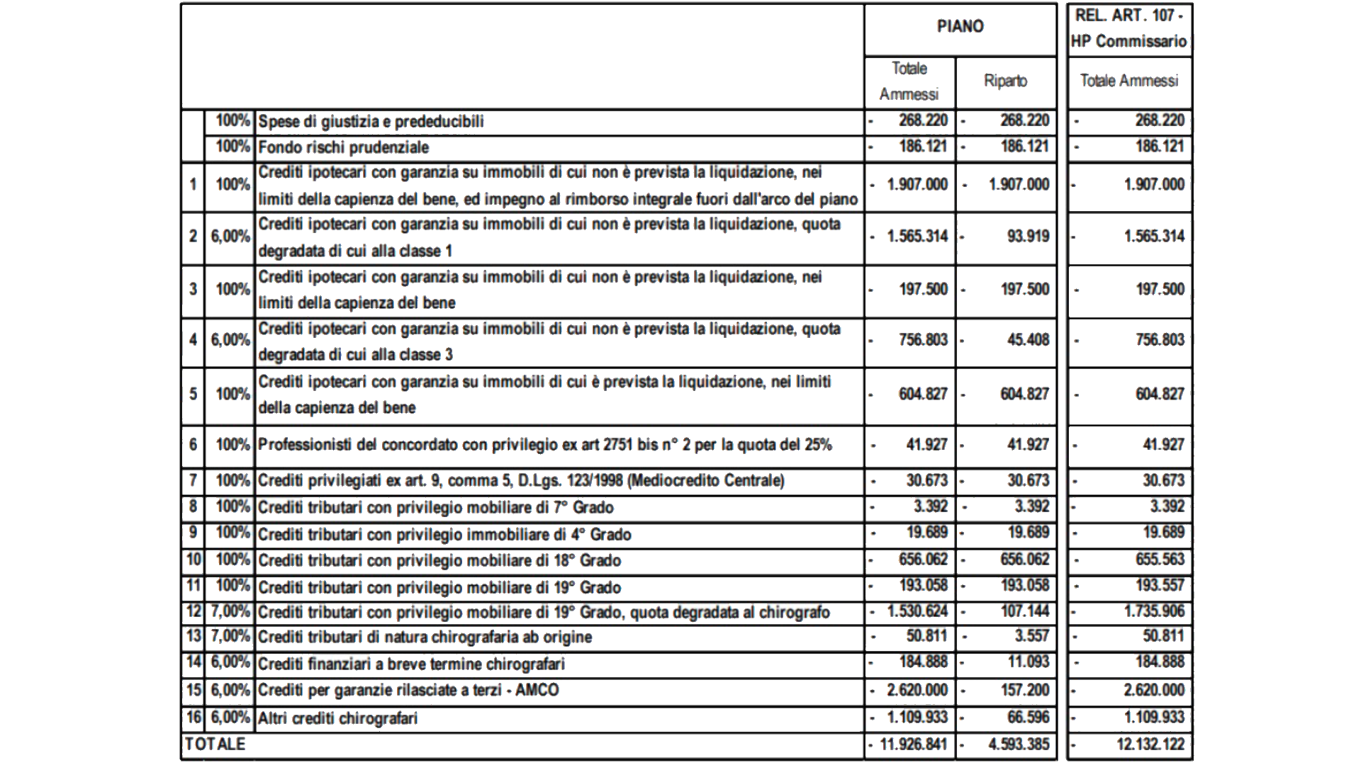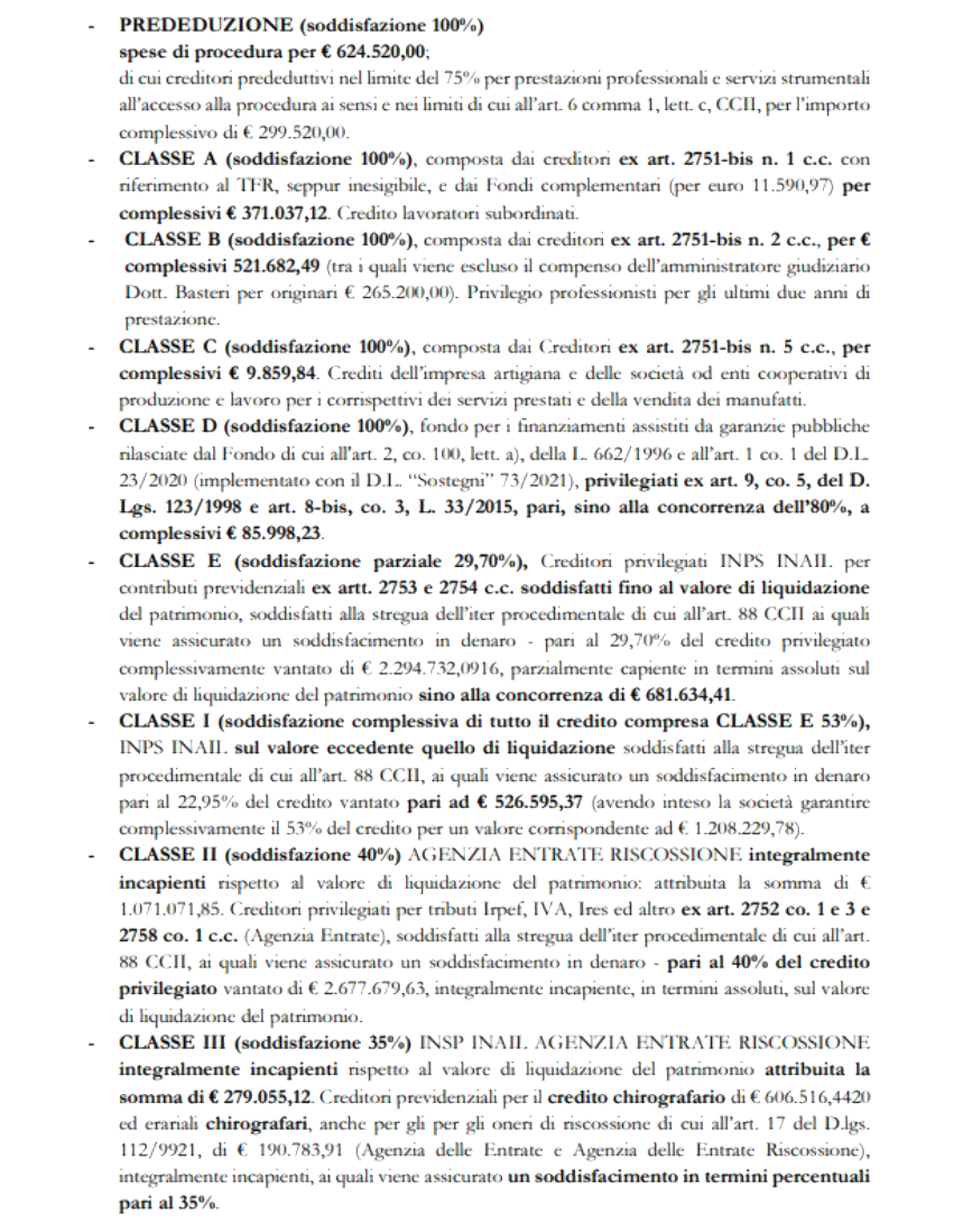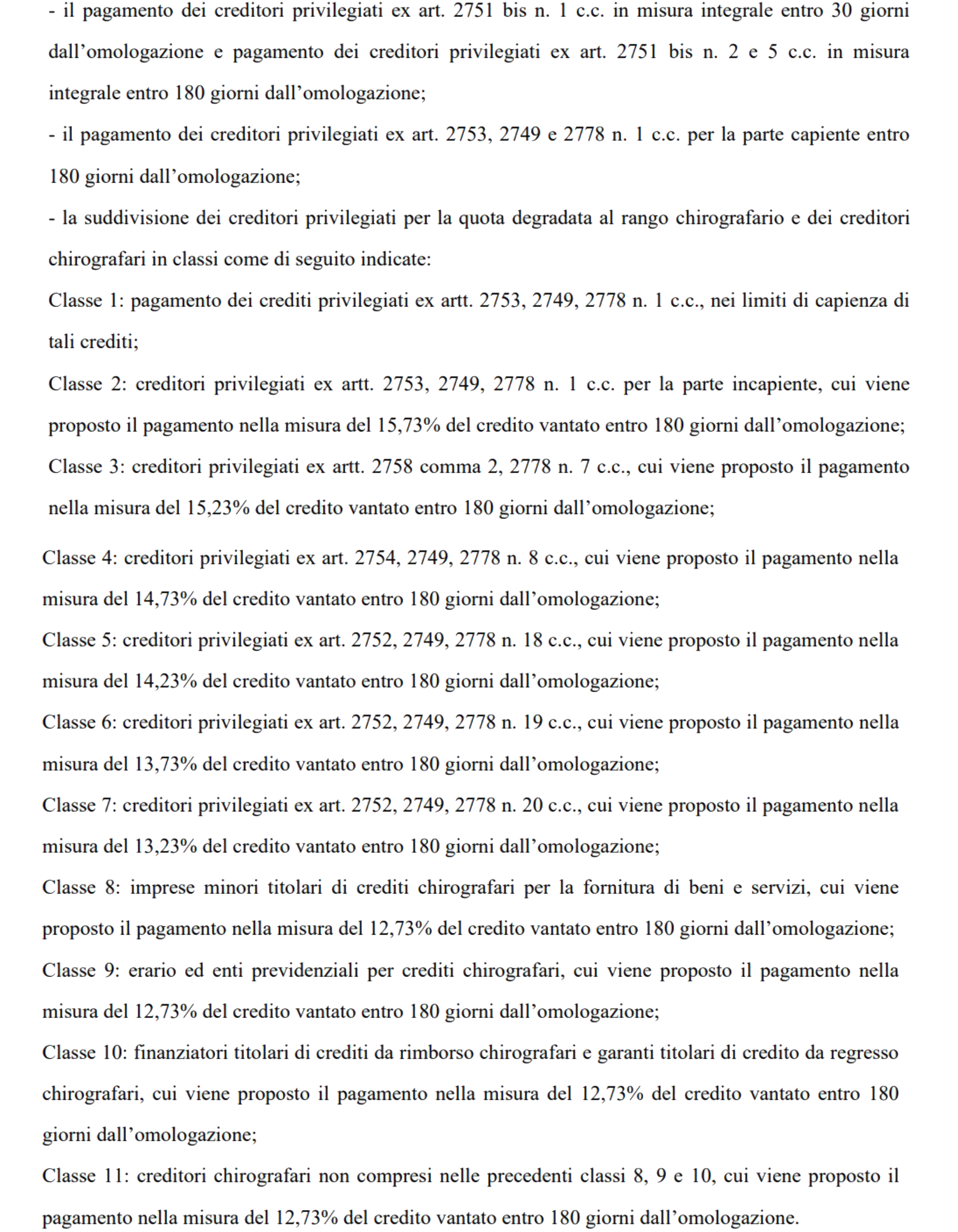 In questo caso, il valore di liquidazione era sufficiente a soddisfare unicamente i dipendenti, per cui tutti i privilegiati successivi, a partire dai professionisti, erano stati declassati al chirografo, per un totale di 10 classi chirografarie "degradate" e 4 classi chirografarie per natura. Le prime 9 classi (quindi, tutti i privilegiati, eccetto l'ultima classe riguardante i tributi locali) venivano trattate allo stesso modo (soddisfacimento del 20%). Le restanti classi (ossia, la residua classe privilegiata degradata al chirografo e le restanti classi chirografarie per natura), invece, ricevevano un trattamento paritario (soddisfacimento del 9%).
