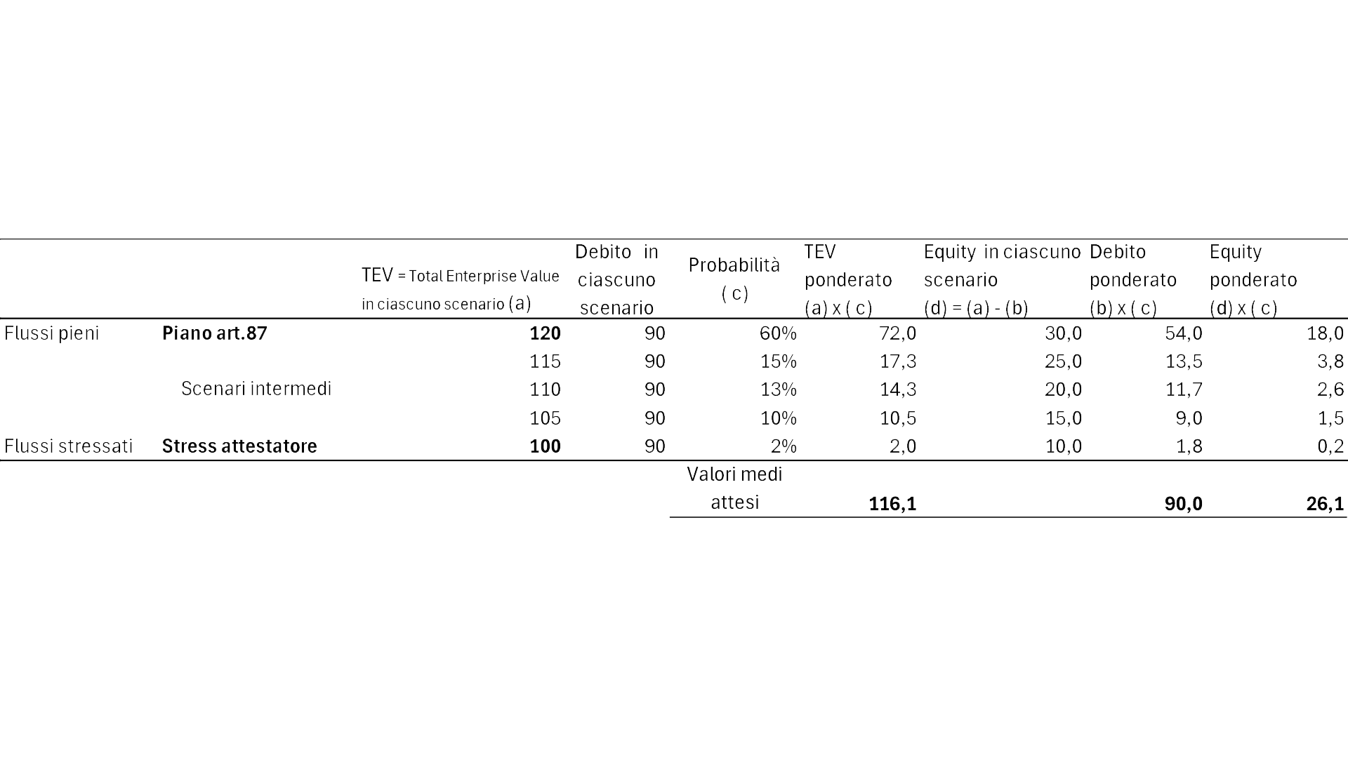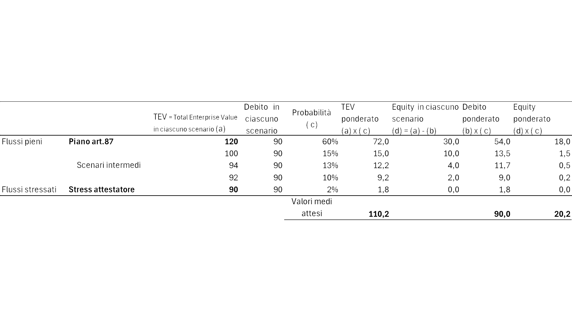- tutto lo spettro di scenari possibili (dal successo del piano di ristrutturazione al suo completo insuccesso e conseguente futura liquidazione);