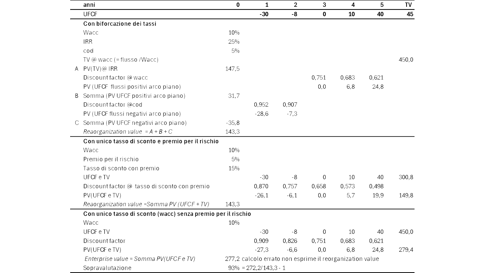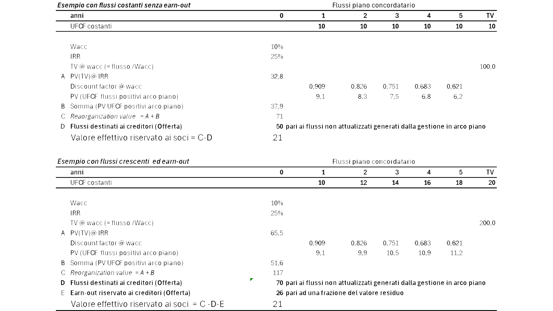 - il valore riservato ai soci è l’attualizzazione all’omologa del valore prospettico post piano, riferito alla futura consistenza patrimoniale dell’azienda risanata (a beneficio degli equity holders, non dei creditori).