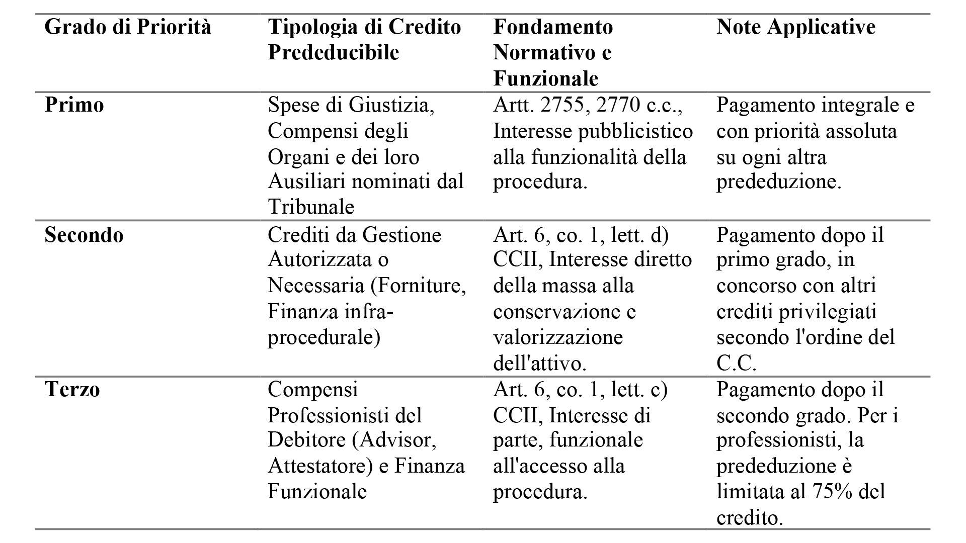 - Prededuzione legale espressa: Riguarda i crediti che una specifica disposizione di Legge qualifica espressamente come tali. Esempi tipici sono i finanziamenti autorizzati dal tribunale in funzione o in esecuzione di una procedura (artt. 99 e 101 CCII).