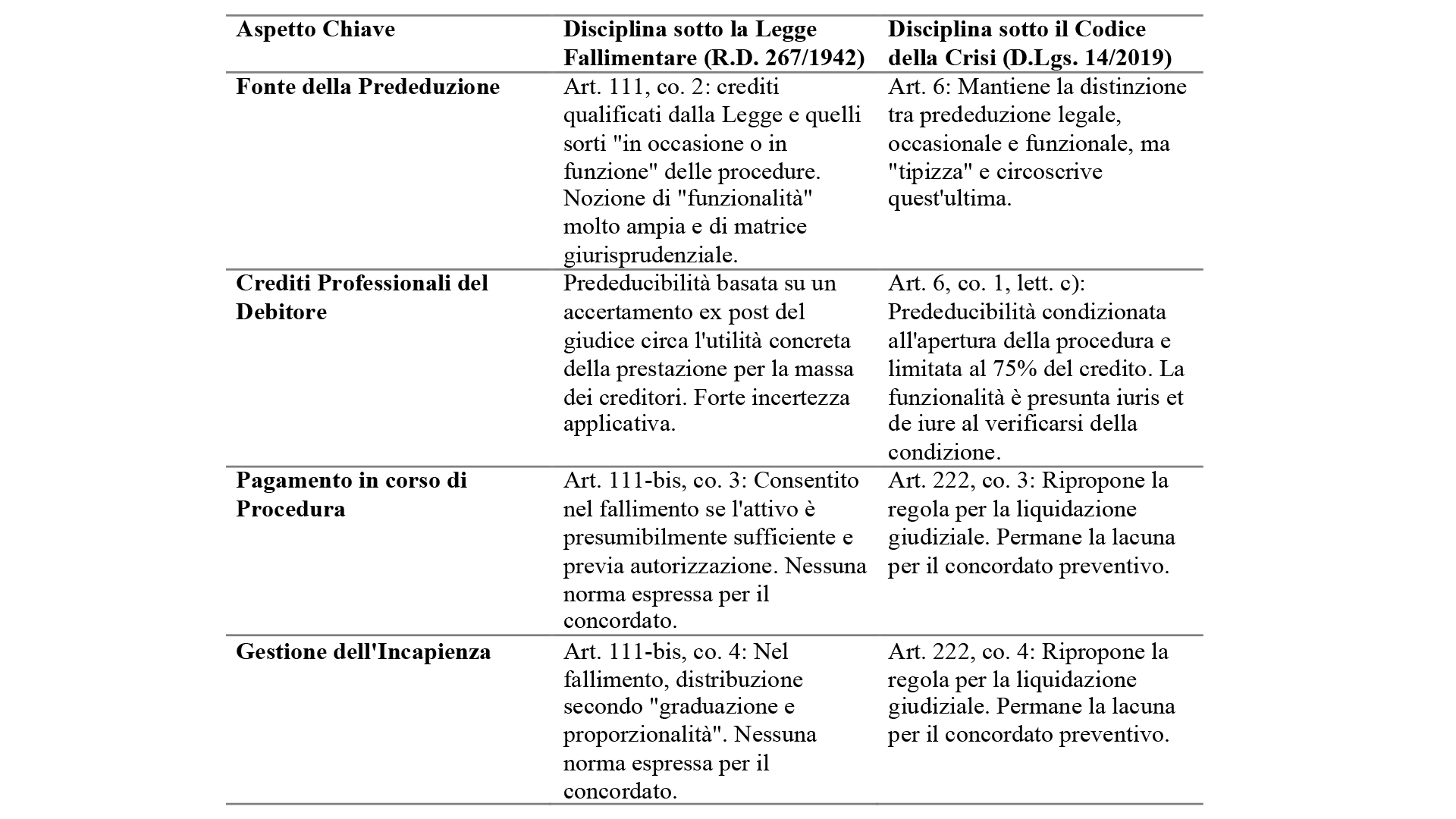 A completamento dell'esame sulle coordinate sistematiche dell'istituto, la seguente tabella offre un confronto sinottico, evidenziando le principali differenze normative e le soluzioni di continuità tra il regime della Legge Fallimentare e l'attuale assetto del Codice della Crisi.